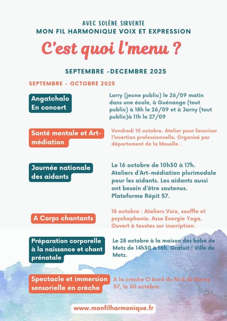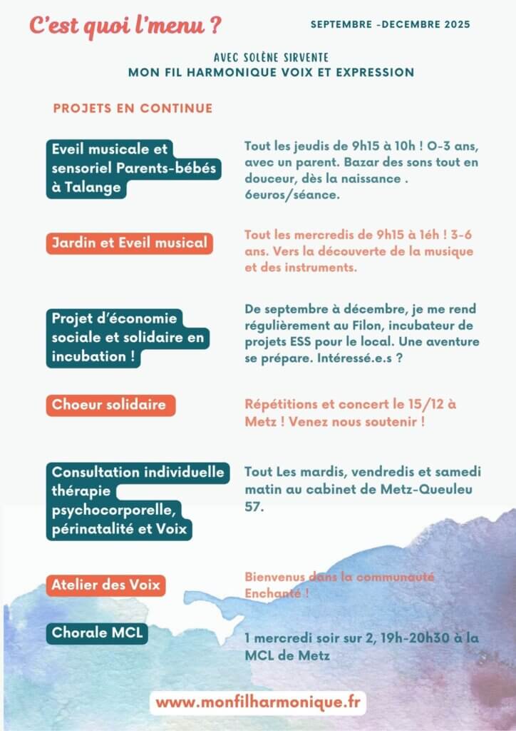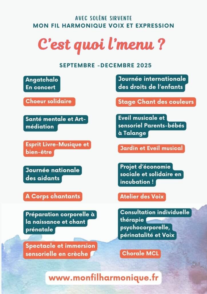 Mon Fil harmonique, c’est principalement un service d’accompagnement de soin psycho-corporel (Art-thérapie, musicothérapie et Voix).
