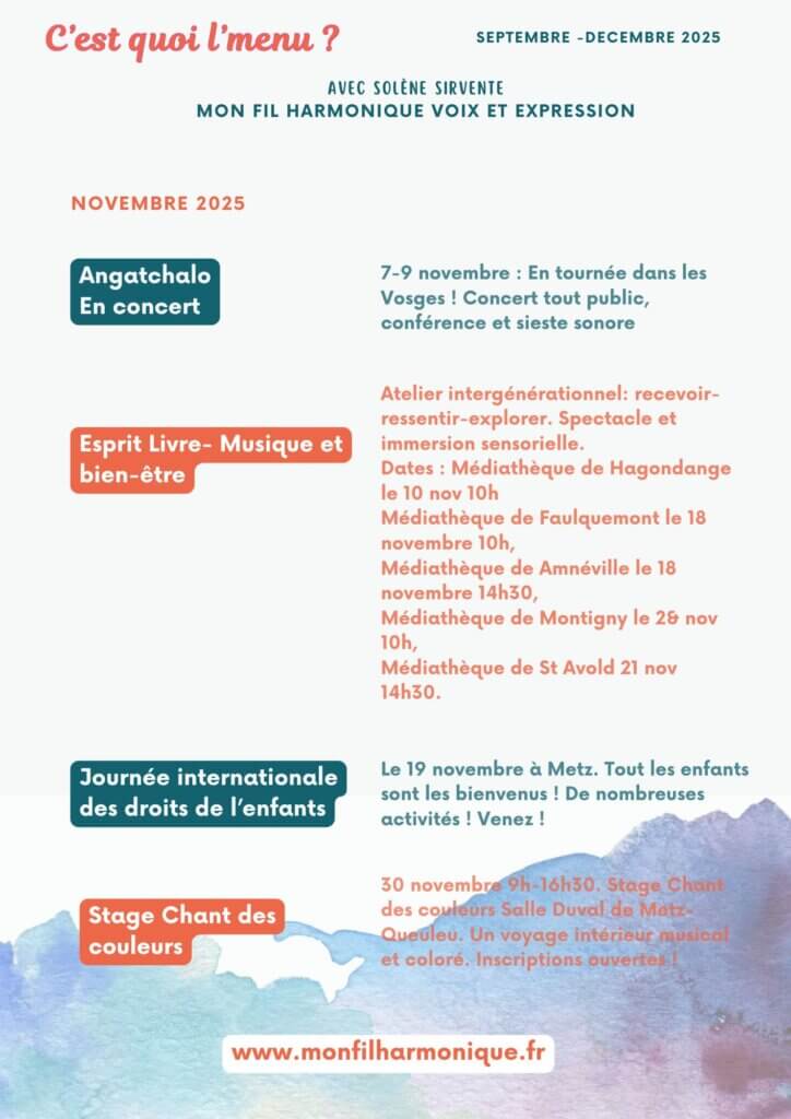 Mais je suis aussi interpellée pour d’autres missions. Ayant un appétit pour la diversité, d’autres activités complémentaires viennent nourrir mon quotidien d’autres expériences, que je vous partage ici : intervention en entreprise, en école, en crèche, en association ou ateliers pour des évènements spéciaux, ou encore activité de chorale et ateliers de la Voix.